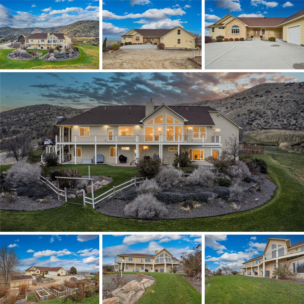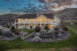 Perched high above the neighbors with majestic 360-degree panoramic views, this fully updated 5-bed (2 master suites), 5-bath, 5,802 sq ft single-level home with walkout basement sits on an expansive 47-acre estate backing directly to BLM land for ultimate privacy & endless recreation. Boasting new luxury flooring throughout, fresh interior paint, & beautiful wood accents, this stunning property offers versatile living options—perfect for multi-generational families, homesteading, or even an event venue/vineyard. The gourmet kitchen is a chef's dream, flooded with natural light & breathtaking views, featuring two spacious islands, granite countertops, Dacor appliances, & rich Alder wood cabinetry. Retreat to the tranquil primary suite with sweeping vistas, a massive jetted soaking tub, dual sinks, oversized full-tile walk-in shower, and a massive walk-in closet appointed with luxurious Alder wood built-ins. Three additional rooms and 2 full bathrooms round out the walkout basement along with a large living space which could easily be converted into a small full kitchen, dining and living. Unique amenities abound: a convenient basement shop with direct loading dock access, climate-controlled safe room, full active greenhouse, chicken coop with chickens included, silo for future events and entertaining, foundation pad ready for a 22x50 shop/outbuilding perfect for an ADU option, and 13 acres of fully irrigated land with established system in place—ideal for farming, gardening, or livestock. With a 27 plantar boxes ready for spring and a newly planted orchard, this property could not get any better! Embrace the endless opportunities of rural luxury living in this one-of-a-kind retreat!
